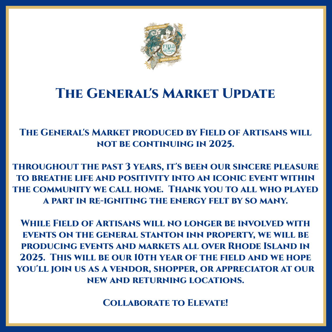 Alongside the new ownership of The General Stanton Inn, Field of Artisans is happy to announce the next chapter of Rhode Island’s longest running market of 56 years. The General’s Market, formerly known as The General Stanton Inn Flea Market, returns this summer Sundays starting Memorial Day Weekend! The General’s Market features an array of art, antiques, vintage and other wholesome products carefully curated by Field of Artisans. Minutes away from the beaches and steps from this famous establishment dating back to 1740, The General’s Market is infused with history, novelty and now considerable refinement. Each Sunday you’ll be given the opportunity to connect with local artisans and creatives to discover their treasures.